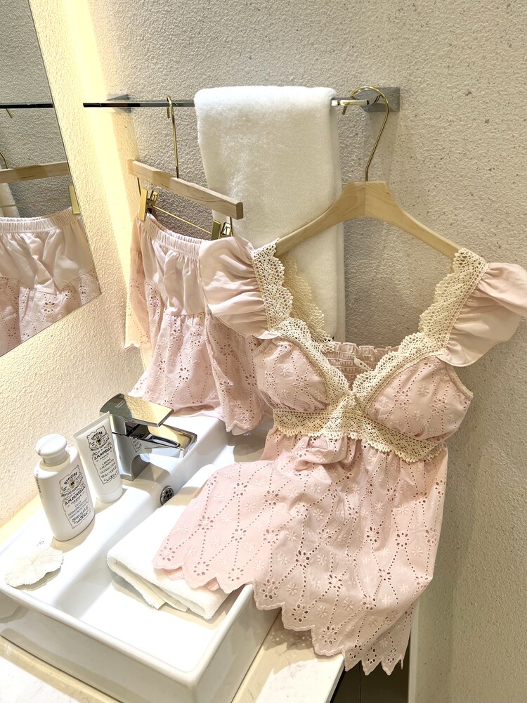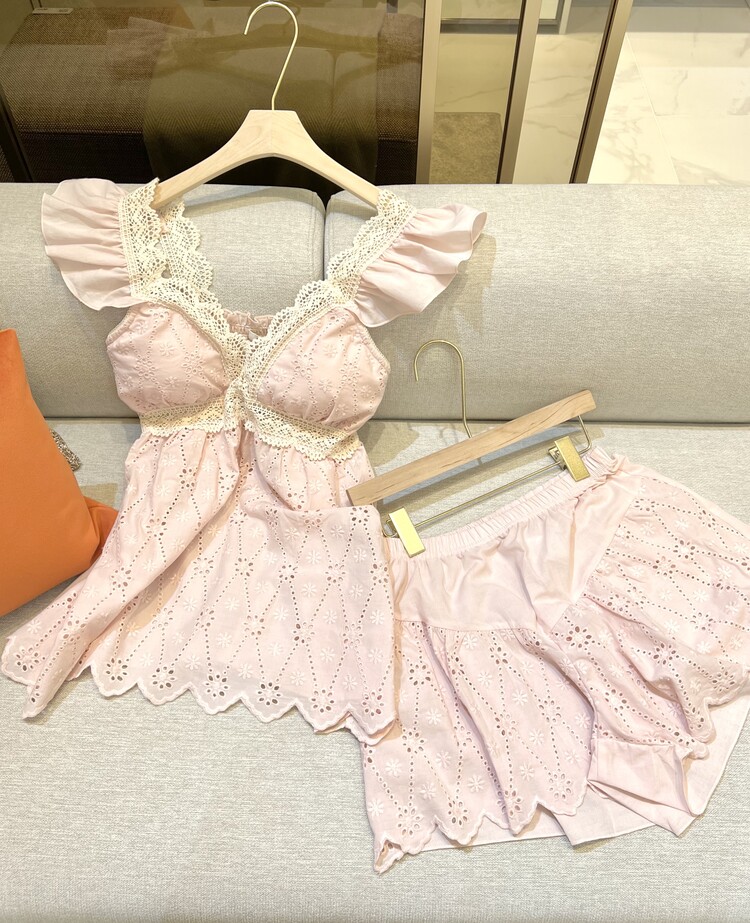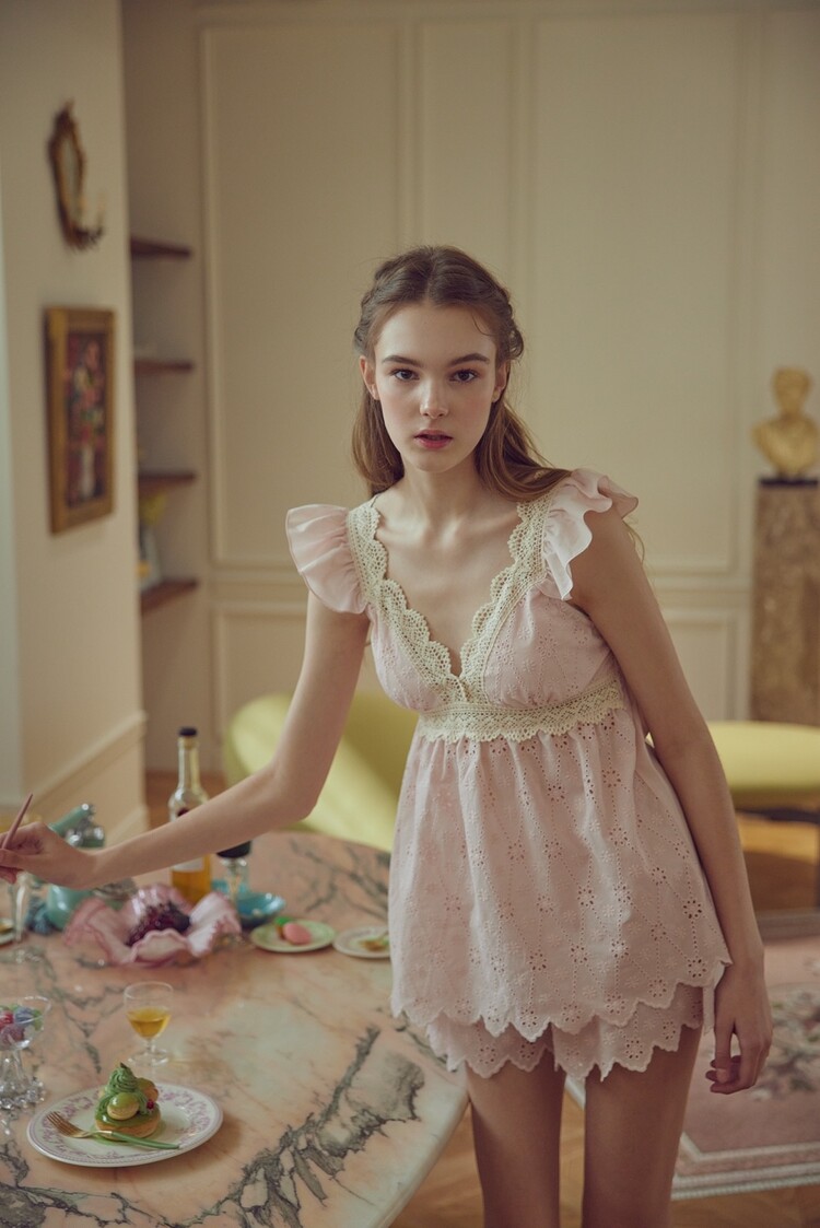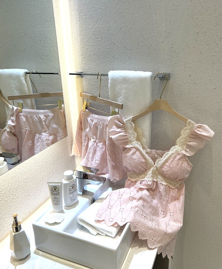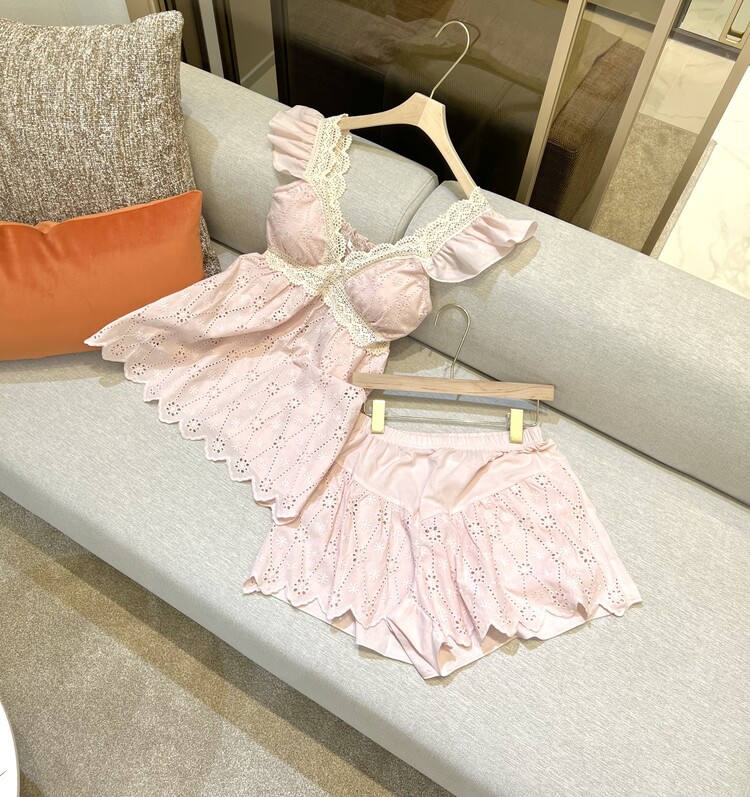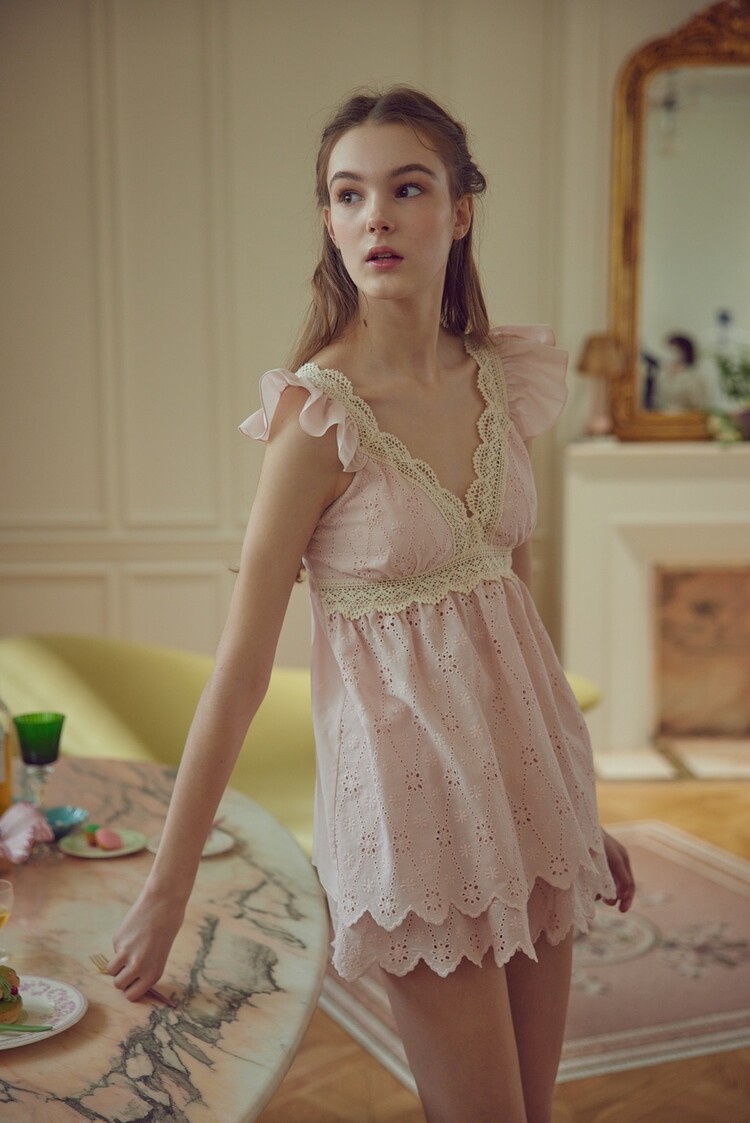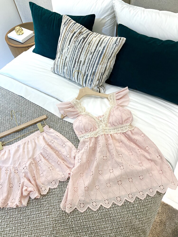 *Comment : 너무나 러블리한 무드가 돋보이는 파자마 세트 입니다. 전체적인 디자인 부터 디테일이 완벽하게 귀엽고 사랑스러운 느낌을 주어요. 물세탁하셔도 크게 변형이 없고 톡톡한 면소재로 소재감은 말할것없이 좋으며 피부에 닿는 촉감이 매우 부드럽고 편안합니디. 가슴부분 패드 기본 내장되어 있어 속옷 착용하지 않고 부담없이 착용하실 수 있습니다. 어깨부분은 풍성하게 프릴이 장식되어있어 귀여우면서 어깨라인을 예뻐보이게 해주고 전체적인 파이핑 레이스패턴이 고급스러움을 느껴지게 해주어요. 사이즈 고민없으시게 넉넉히 두가지로 준비했습니다. 홈웨어 좋아하시는 분들 적극 추천드리며 만족하실 디자인 입니다. 집들이 선물로도 좋으며 편안하게 집에서 생활하실때에도 아무거나 입는것 보다 나를 위한 예쁜 잠옷, 예쁜 홈웨어가 주는 기분전환과 행복이 특별한 것 같아요.^^ 자신있게 추천드립니다