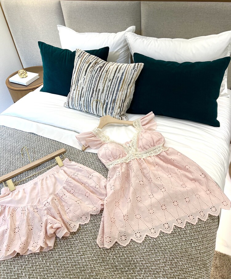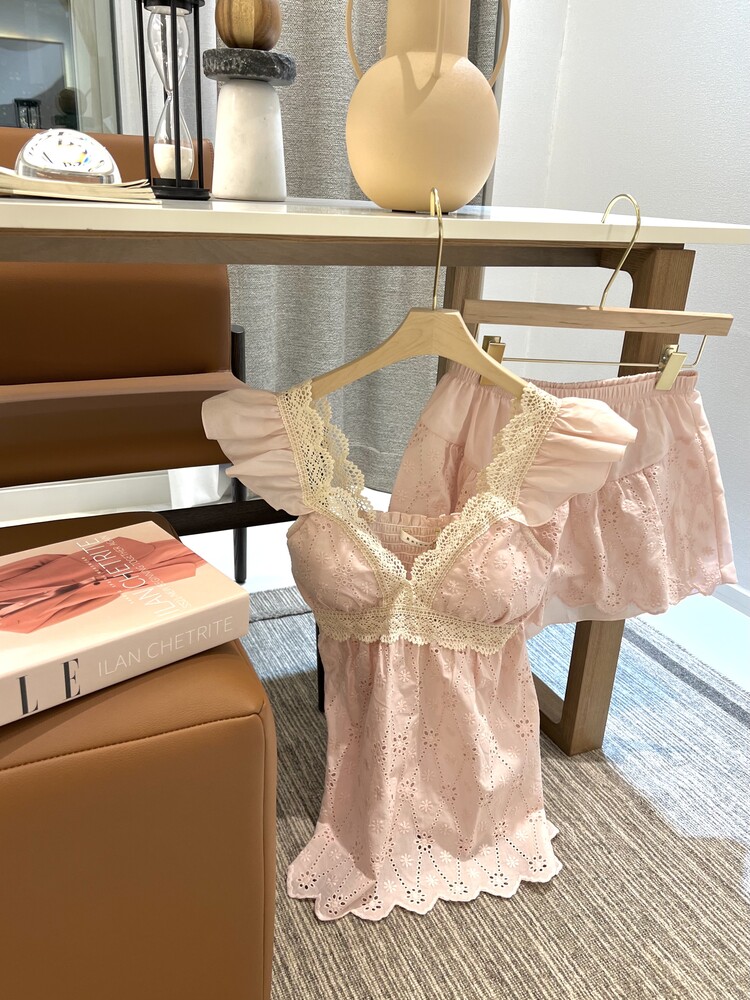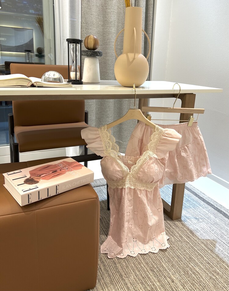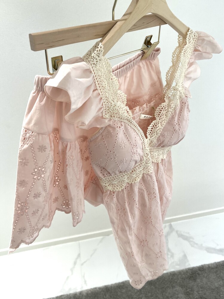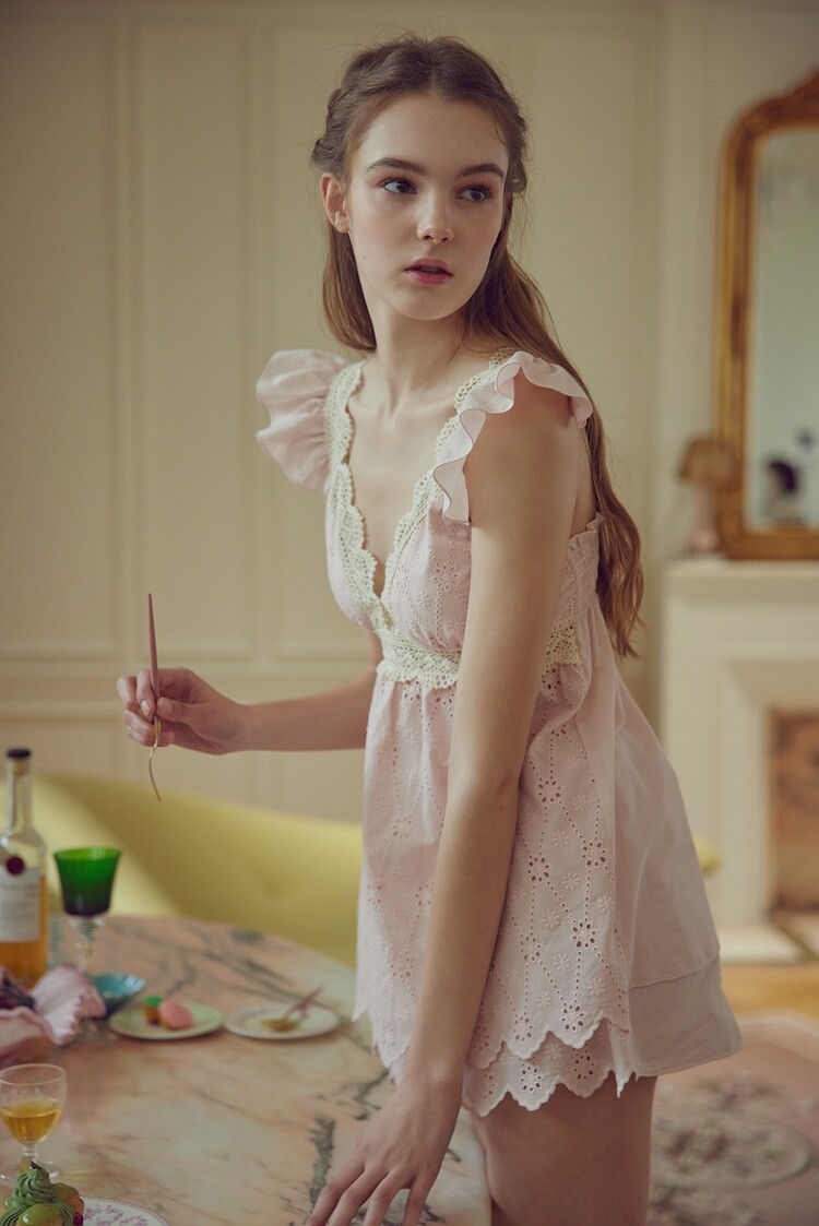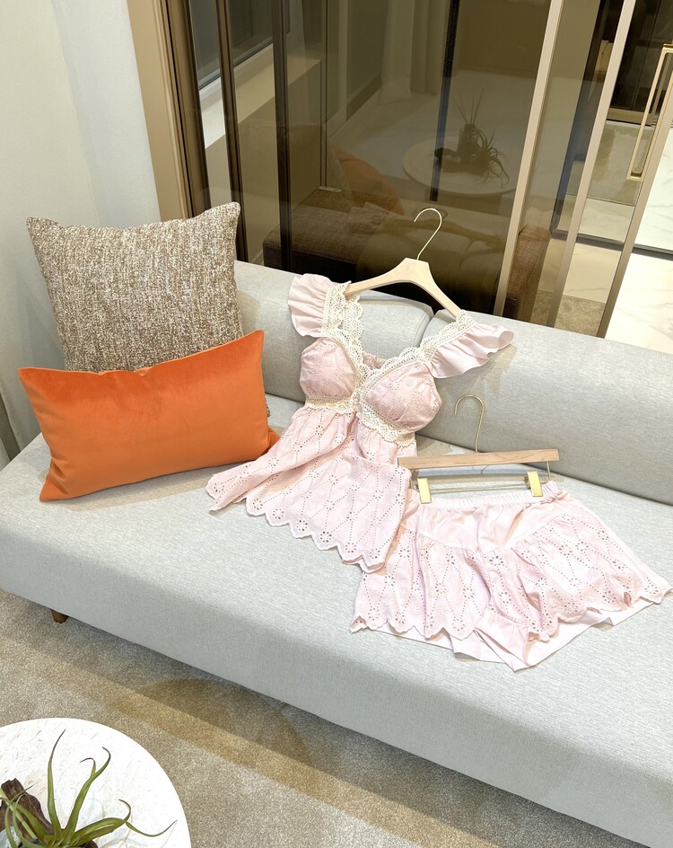 *Comment : 너무나 러블리한 무드가 돋보이는 파자마 세트 입니다. 전체적인 디자인 부터 디테일이 완벽하게 귀엽고 사랑스러운 느낌을 주어요. 물세탁하셔도 크게 변형이 없고 톡톡한 면소재로 소재감은 말할것없이 좋으며 피부에 닿는 촉감이 매우 부드럽고 편안합니디. 가슴부분 패드 기본 내장되어 있어 속옷 착용하지 않고 부담없이 착용하실 수 있습니다. 어깨부분은 풍성하게 프릴이 장식되어있어 귀여우면서 어깨라인을 예뻐보이게 해주고 전체적인 파이핑 레이스패턴이 고급스러움을 느껴지게 해주어요. 사이즈 고민없으시게 넉넉히 두가지로 준비했습니다. 홈웨어 좋아하시는 분들 적극 추천드리며 만족하실 디자인 입니다. 집들이 선물로도 좋으며 편안하게 집에서 생활하실때에도 아무거나 입는것 보다 나를 위한 예쁜 잠옷, 예쁜 홈웨어가 주는 기분전환과 행복이 특별한 것 같아요.^^ 자신있게 추천드립니다