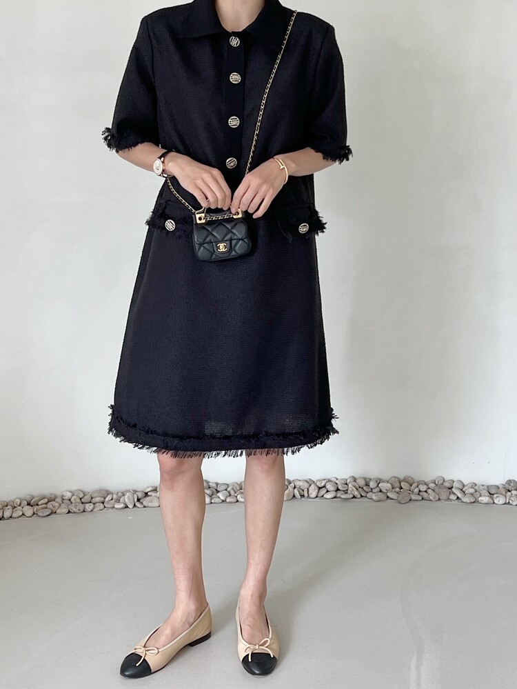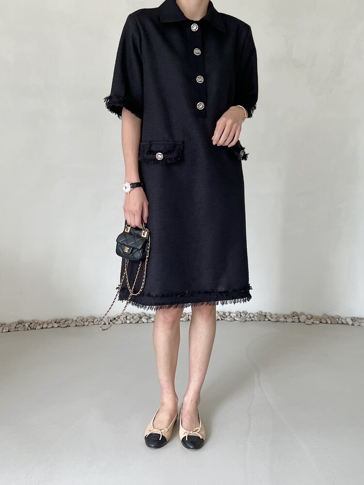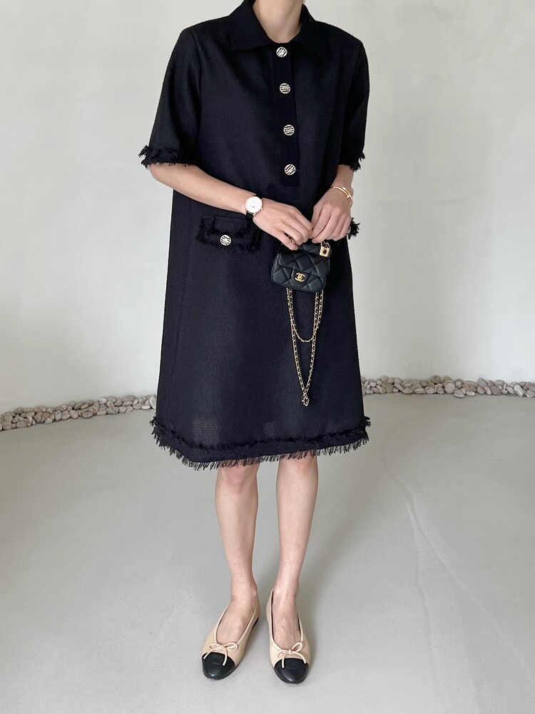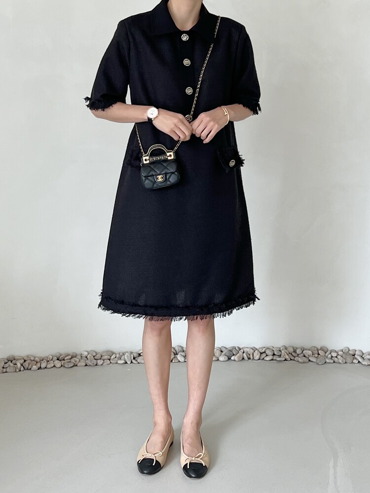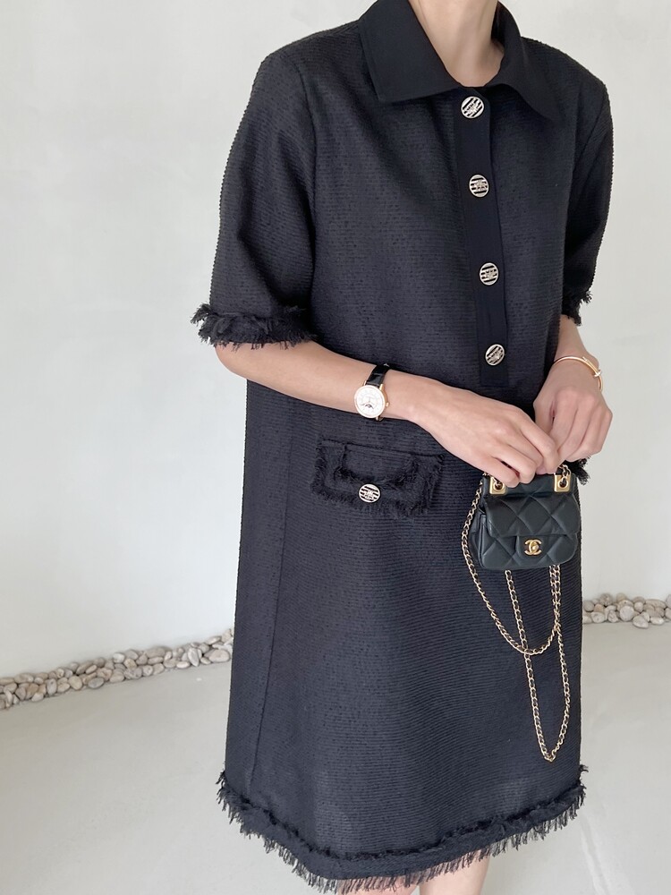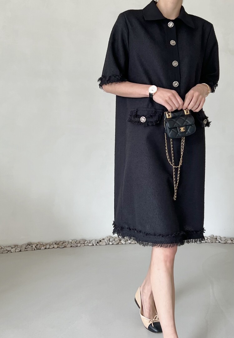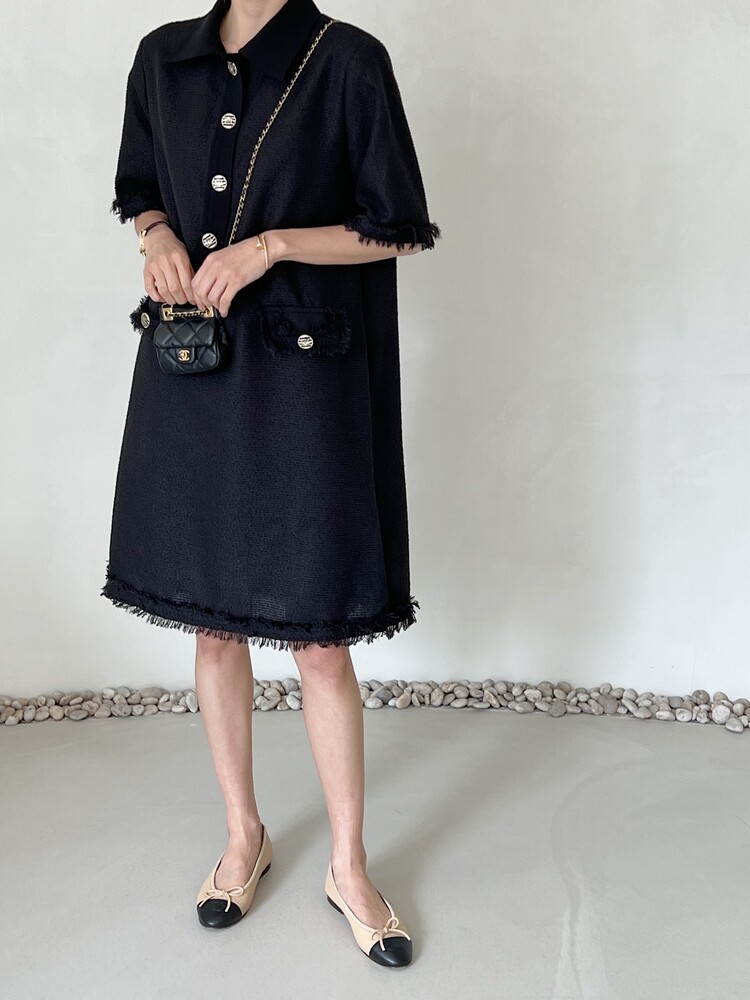 *Comment : 고급스러운 무드의 트위드 미니 원피스 입니다. 넉넉한 핏으로 편안하게 착용하실 수 있고, 미니 원피스이지만 너무 짧지 않는 미니기장감으로 부담없이 즐기실 수 있습니다. 고급스러운 단추 버튼 디테일과, 소매부분은 넉넉한 기장감으로 어깨라인과 팔뚝살을 슬림해 보이는 효과를 주었어요. 시원한 소재감으로 여름철에도 덥지 않게 착용하실 수 있어요. 단아하고 깔끔한 트위드 원피스 찾으셨다면 적극 추천드립니다♡
