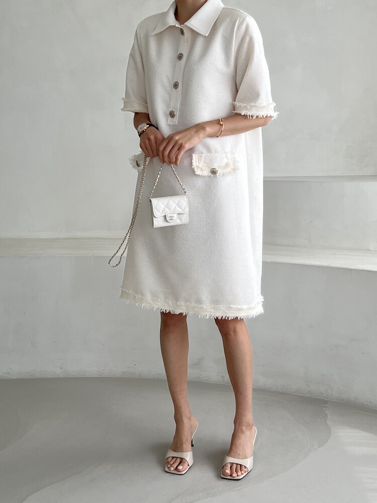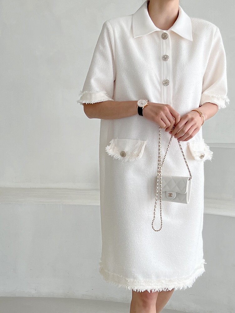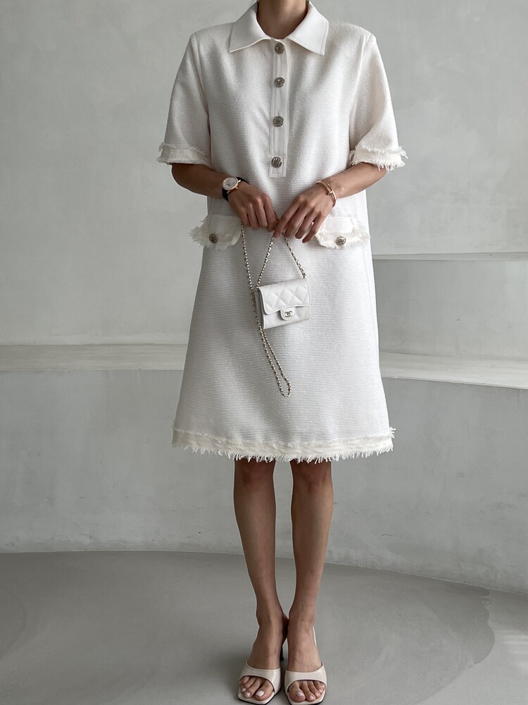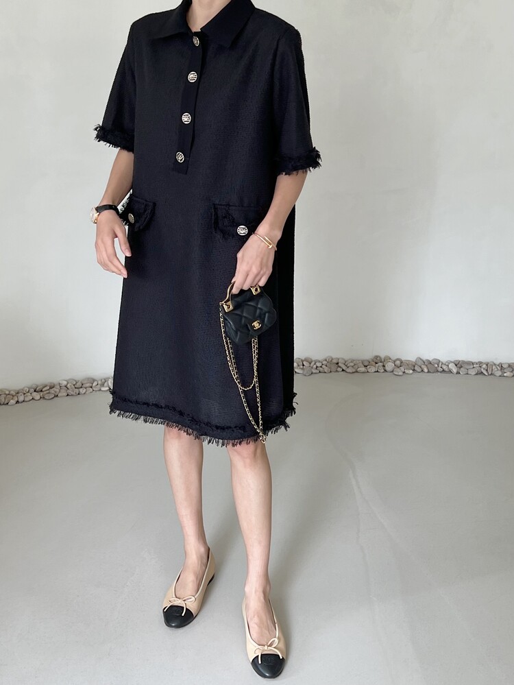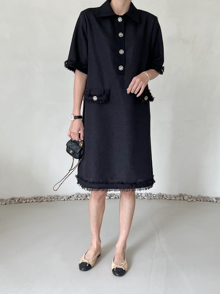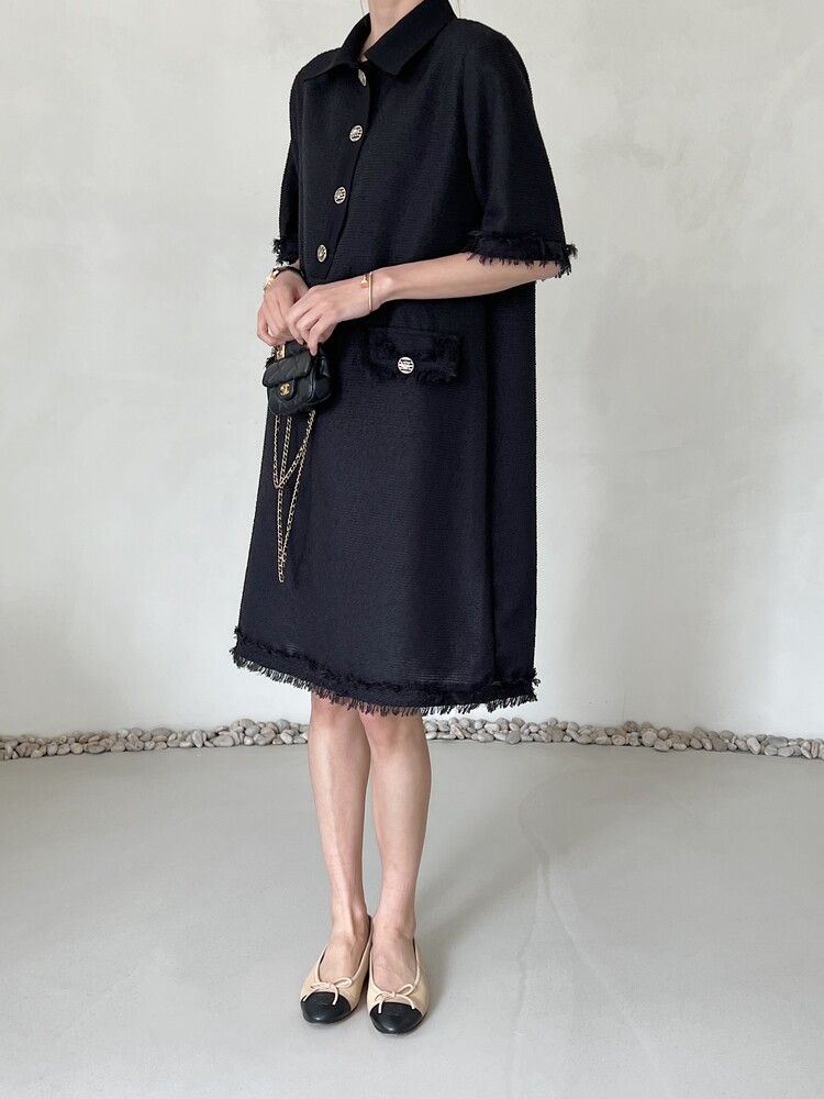 *Comment : 고급스러운 무드의 트위드 미니 원피스 입니다. 넉넉한 핏으로 편안하게 착용하실 수 있고, 미니 원피스이지만 너무 짧지 않는 미니기장감으로 부담없이 즐기실 수 있습니다. 고급스러운 단추 버튼 디테일과, 소매부분은 넉넉한 기장감으로 어깨라인과 팔뚝살을 슬림해 보이는 효과를 주었어요. 시원한 소재감으로 여름철에도 덥지 않게 착용하실 수 있어요. 단아하고 깔끔한 트위드 원피스 찾으셨다면 적극 추천드립니다♡